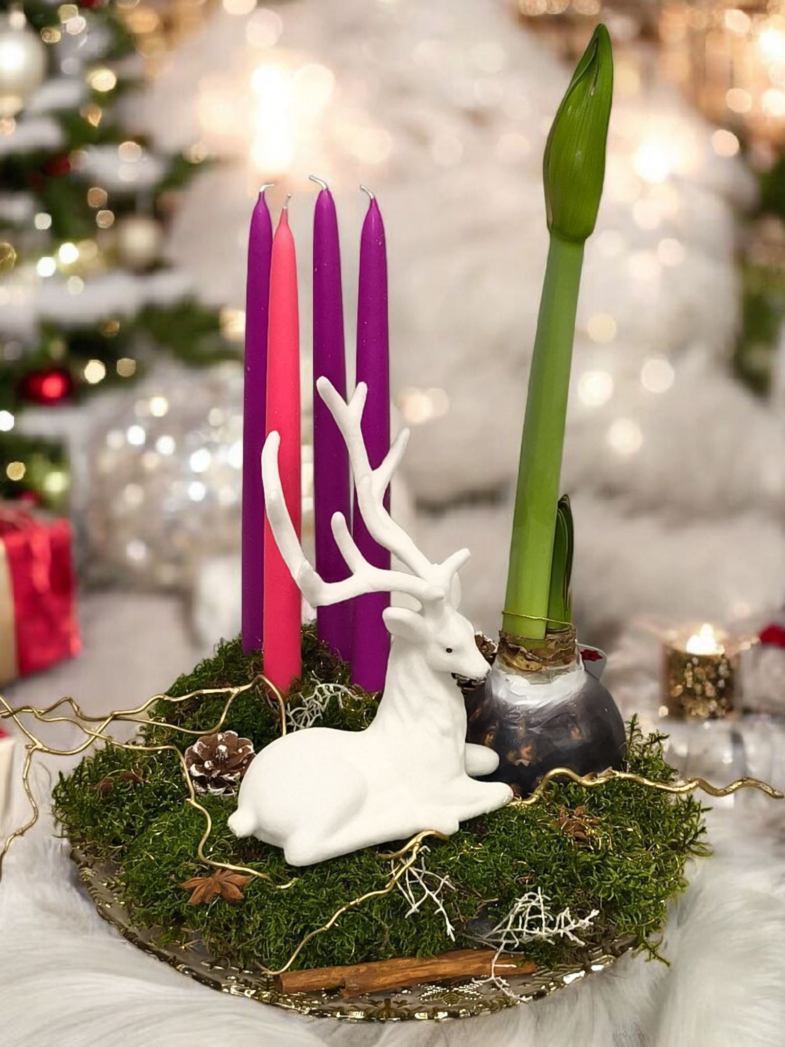 Advento kompozicija tiems kas mėgsta originalumą ir paprastumą. Kompozicija be pridėtinių blizgucių. Ant prabangaus stiklo padėklo , natūralios samanos paklotėje sukurta miško pasaka.