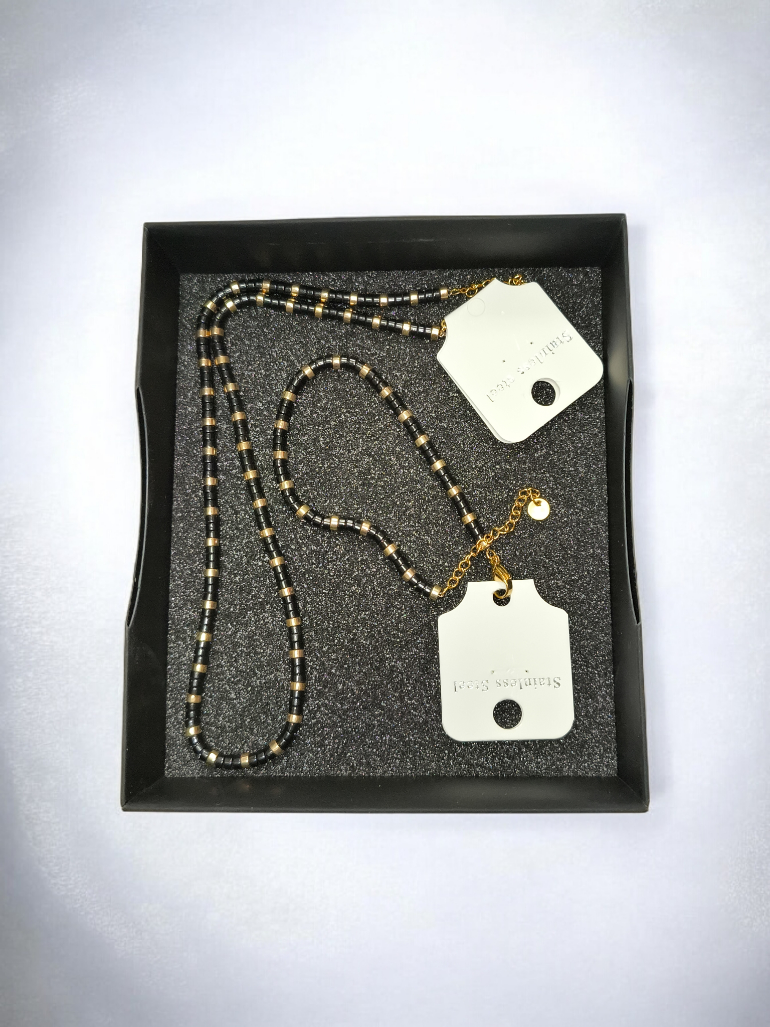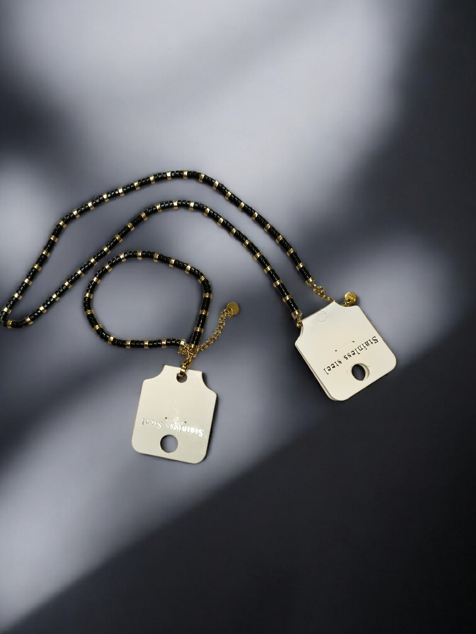 Papuošalai – polimerinio molio grandinėlė ant kaklo ir apyrankė.