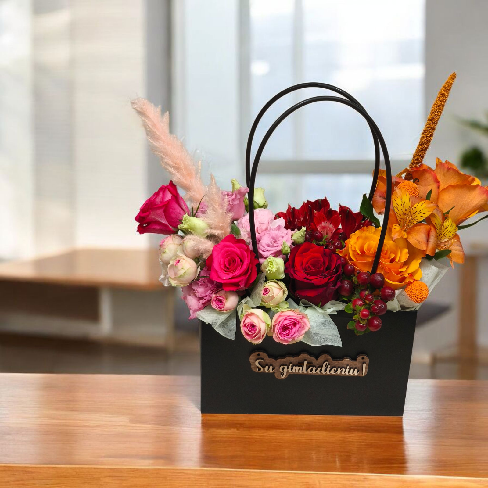 Šis gėlių krepšelis su užrašu „Su gimtadieniu!“ puikiai tiks tiek moteriai, tiek vyrui, vertinančiam išskirtinumą ir grožį. Juodas, modernus krepšelio dizainas suteikia kompozicijai prabangos ir universalumo – ji dera tiek prie klasikinio, tiek prie modernaus stiliaus interjero.