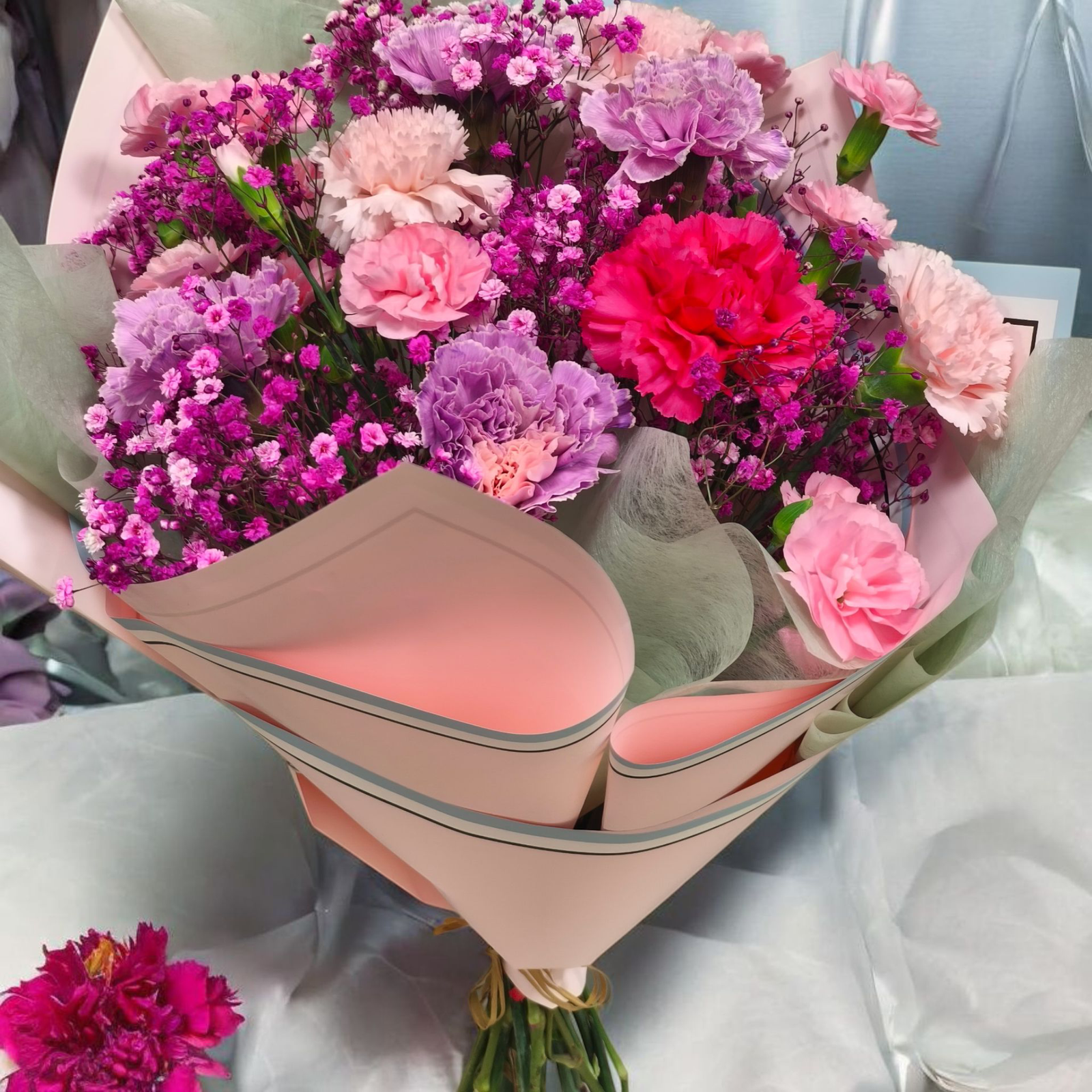 Gvazdikų puokštė – gubojoje sukomponuoti įvairių atspalvių gvazdikai ir smulkiažiedžiai gvazdikai. Tai spalvinga ir linksma puokštė. Mūsų gėlių parduotuvėje kuriame išskirtinius derinius iš šviežių, kruopščiai atrinktų gėlių, kad kiekviena akimirka taptų ypatinga. Pas mus rasite ne tik klasikinės elegancijos rožių, subtiliųjų bijūnų ar romantiškų lelijų, bet ir modernių, spalvotų kompozicijų, kurios nustebins savo originalumu. Rūpinamės, kad gėlės išliktų šviežios kuo ilgiau, todėl kiekvieną užsakymą ruošiame su meile ir atidumu. Gvazdikų puokštės vis labiau populiarėja. Jos vertinamos dėl spalvinės gamos gausos, dėl ilgo stovėjimo vazoje. Tinka dovanoti įvairioms progoms – gimtadieniams, vestuvėms, jubiliejams ar tiesiog maloniai staigmenai artimajam. Mūsų tikslas – skleisti džiaugsmą ir padėti išreikšti jausmus be žodžių. Užsukite ir atraskite grožį, kuris įkvepia kasdienybėje.