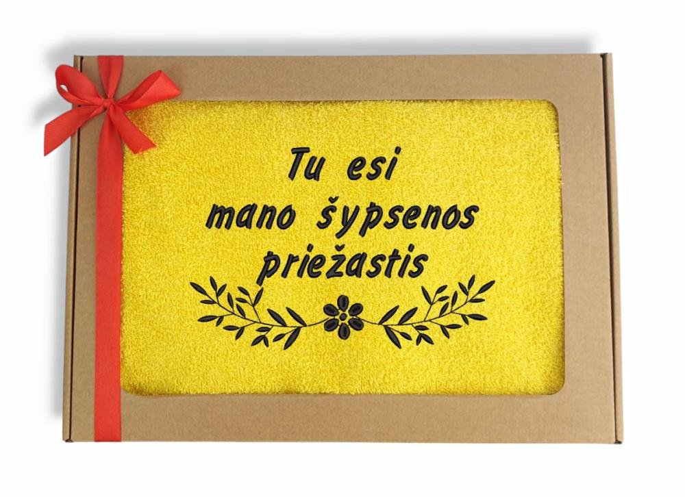 Medvilninis rankšluostis su išsiuvinėtu užrašu „Tu esi mano šypsenos priežastis“.  Rankšluostis kokybiškas, tvirtas, gerai sugeriantis drėgmę. Natūralus 100% medvilninis pluoštas. Rankšluostis supakuotas skaidriame krepšelyje.