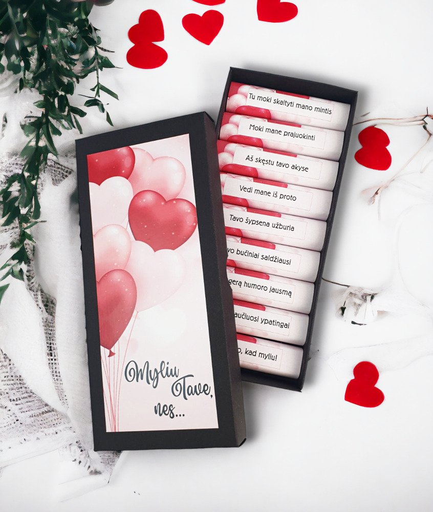 Šokoladų rinkinys – pieniško šokolado plytelės su pieniniu įdaru ir 9 priežastys, kodėl myli. Šokoladai bei dėžutė papuošta širdelių motyvo paveiksliukais. Ši dovana leis ne tik nustebinti mylimą, bet leis ir pasimėgauti saldžia akimirka.